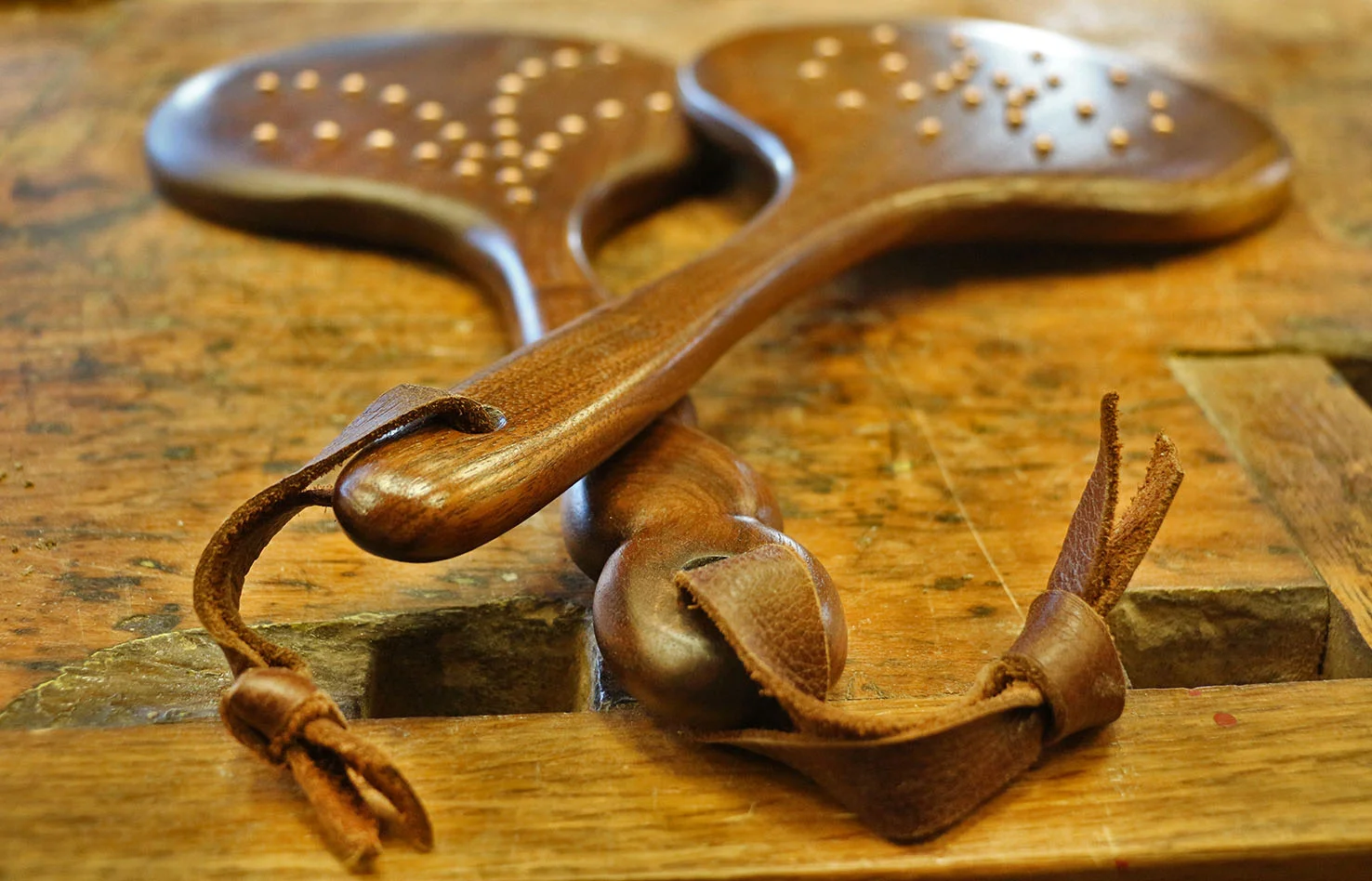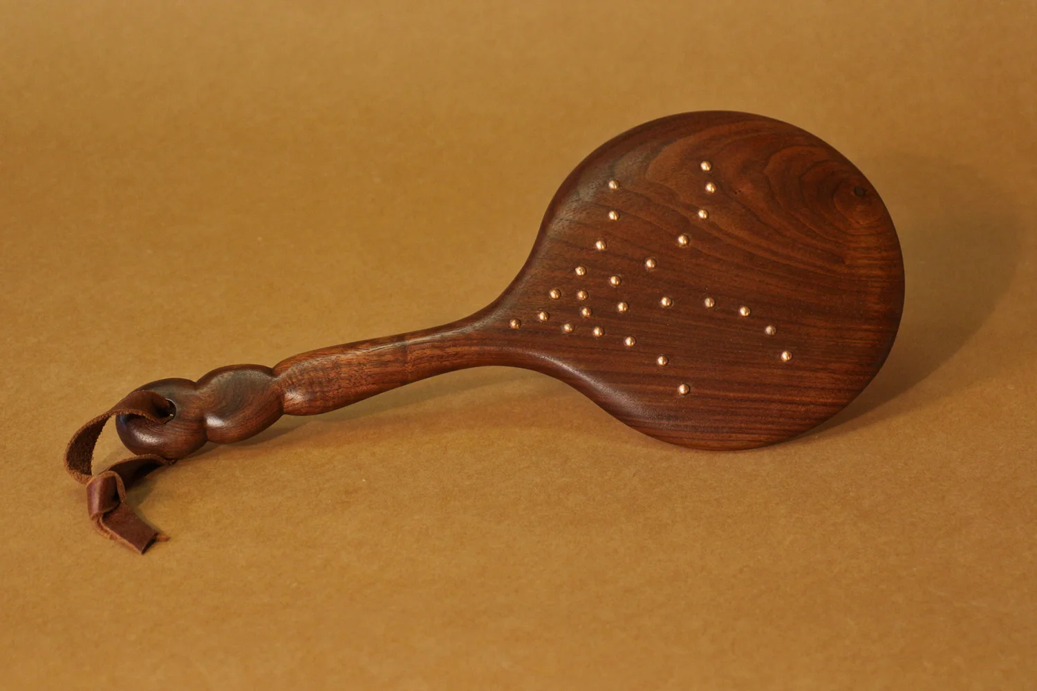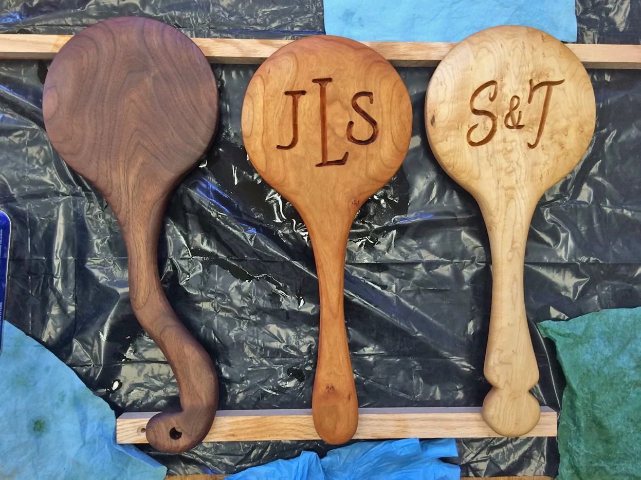 Each mirror is shaped by hand for a comfortable handle grip. The mirrors can be commissioned to be made from any hardwood. Details such as a monogram, inlays, brass rivets, and patterned glue-ups are available at an additional cost. For easy hanging storage, your mirror can come with a leather loop tied through the end of it's handle.