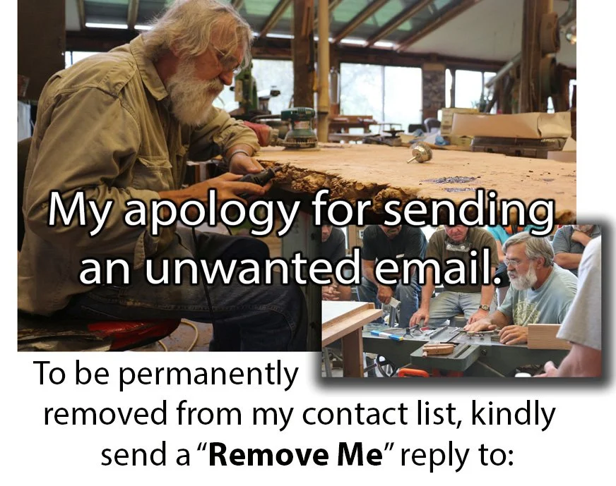 Please send your reply to “Remove Me” to Jeff@LohrWoodworkingStudio.com